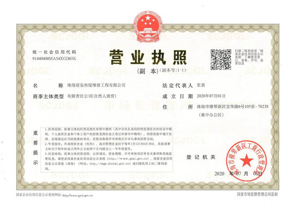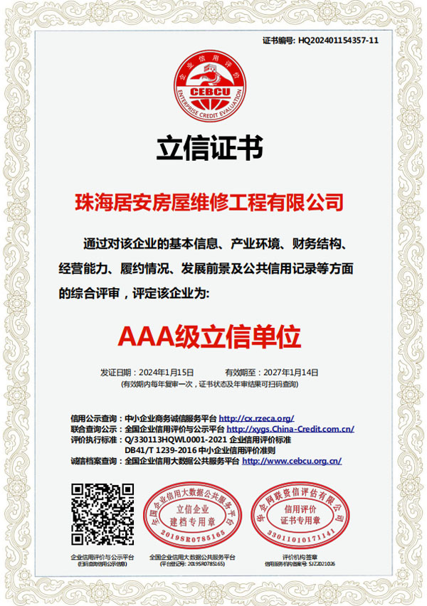 珠海居安房屋維修工程有限公司成立于2020年,是一家專注房屋維修的公司。我們擁有各類型專業(yè)人才,業(yè)務(wù)包括老舊建筑翻新改造、外墻空鼓修復、防水幕墻養(yǎng)護、外墻預(yù)置構(gòu)件拆除更換、供排水管網(wǎng)改造、墻面翻新、鋼制結(jié)構(gòu)建筑構(gòu)建及折除,外墻清洗及裝修裝飾。